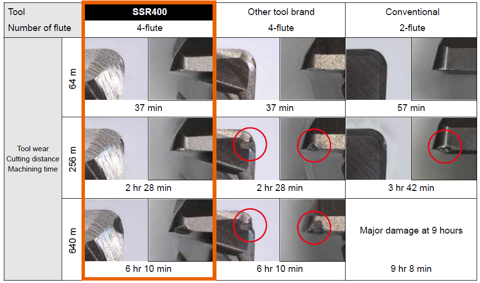 Bahkan di bawah geometri benda kerja dengan beban tinggi, seperti sudut SSR400 memungkinkan pemesinan yang disperpanjang tanpakerusakan besar