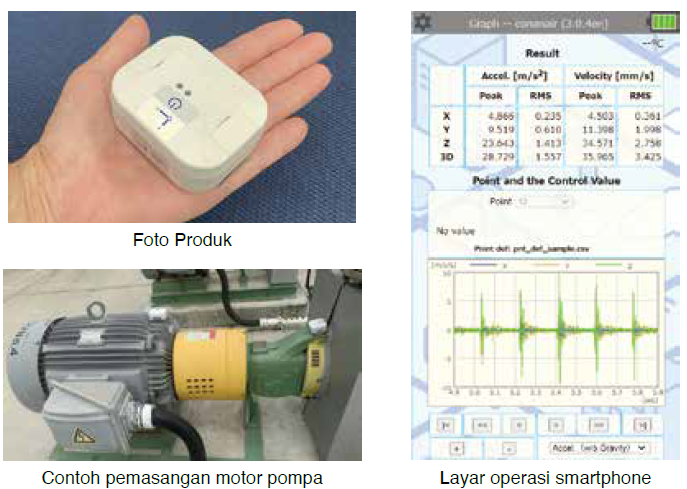 - Pengukuran getaran simultan pada 3 axis memungkinkan fleksibilitas orientasi pemasangan