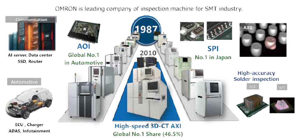 Bisnis Sistem Inspeksi OMRON telah menjadi pemimpin dalam peningkatan kualitas manufaktur selama hampir 40 tahun. Bisnis ini dimulai pada tahun 1987 dengan mengembangkan mesin inspeksi (AOI) untuk proses pemasangan komponen pada papan sirkuit elektronik, menggunakan teknologi pemrosesan gambar dari bisnis kesehatan OMRON (misalnya teknologi penghitungan sel darah merah).
